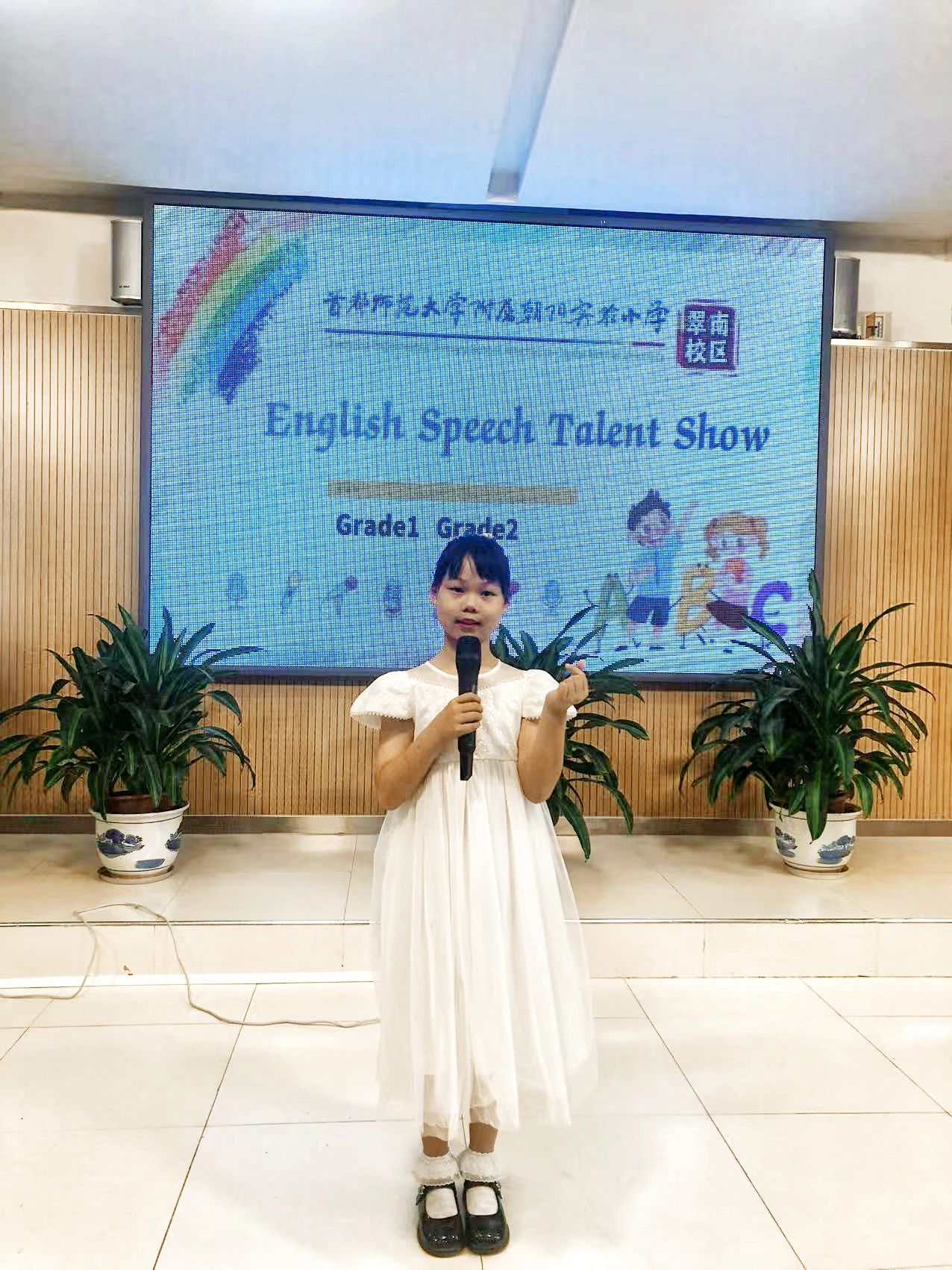 我们的爱很珍贵、很伟大,二4班张钰琪同学带来英文歌曲《A little love》,她美妙的嗓音颇具感染力。 我们都爱我们的祖国,接下来一6班的郭俊妍同学带来了演讲《I love China》并结合了中国传统乐器介绍,呈现了一场听觉与视觉的盛宴。 来自一2班的王潇可同学给我们带来了一个关于小男孩和他的苍蝇朋友的有趣故事《A boy and his friend fly guy》,引得现场欢笑连连。