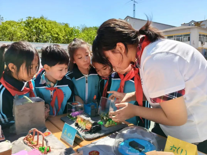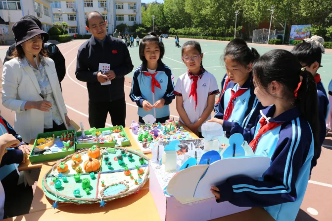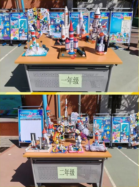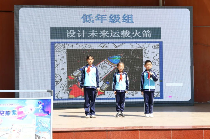 作为全国航天特色学校,学校以项目式活动成果展示彰显学生的科创风采。低年级学生代表林宇桐介绍“火箭模型制作”项目,孩子们从“长征”火箭命名的红色渊源中汲取灵感,用材料将设计图转化为立体模型,致敬中国航天的“运载基石”;中年级姚品伊分享 “太空蔬菜种植”方案,聚焦无土栽培、模块化设计等难题,为“航天员的星际菜篮”描绘雏形;高年级孔熙语展示“月球基地建设” 创意,涵盖居住舱、能源系统、应急通讯等模块,融入智能运输、太阳能供电等巧思,展现出对月球生存的系统性思考。从 “飞天工具”到“太空生活”再到“地外家园”,充分体现出不同学年段学生的科创能力与协作精神。