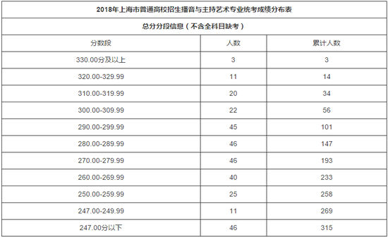 根据上海市教育考试院《关于印发<2018年上海市普通高校艺术类专业招生实施办法>的通知》(沪教考院高招〔2017〕45号)的文件要求,经审定,2018年上海市普通高校招生播音与主持艺术专业统考合格线为总分不低于247.00分,图片述评单科成绩不低于100.00分,文稿朗读和才艺展示单科成绩不低于50.00分。